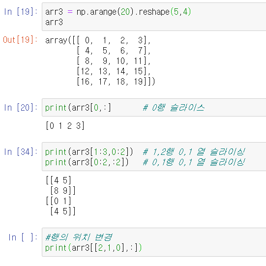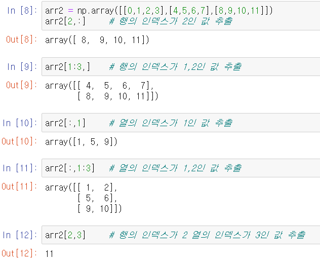 - 다차원 배열의 원소 중 복수 개를 접근하려면 일반적인 파이썬 슬라이싱(slicing)과 comma(,)를 함께 사용