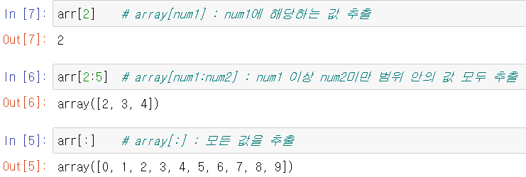 - 배열의 인덱싱은 리스트와 같이 대괄호( [ ] )를 사용한다.
