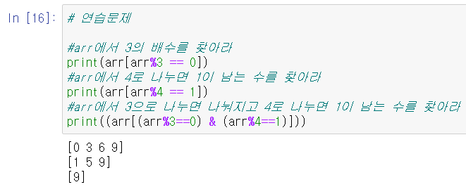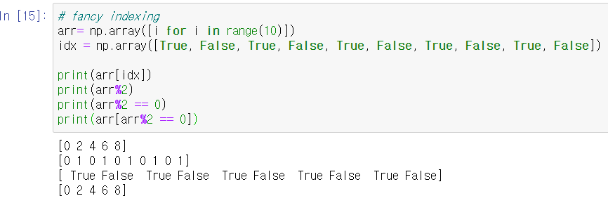 - 팬시 인덱싱은 정수나 불린(Boolean) 값을 가지는 다른 Numpy 배열로 배열을 인덱싱할 수 있는 기능을 의미한다.